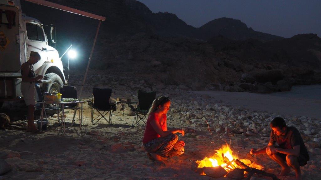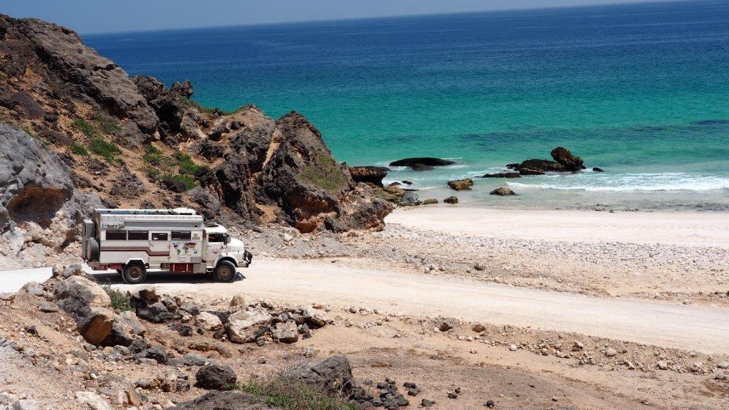 Westlich von Salalah verbringen wir die Nacht nach einer atemberaubenden Autofahrt auf ebenso atemberaubenden Streckenabschnitten, die geradlinig über die Berge führen (Thunder kriecht hier nicht selten mit 10 km/h mühsam bergauf). In 400 m Höhe Traumplatz mit Blick auf das Meer. Wir behaupten alle, dies sei einer der schönsten Plätze, auf dem wir je mit Thunder gestanden haben.